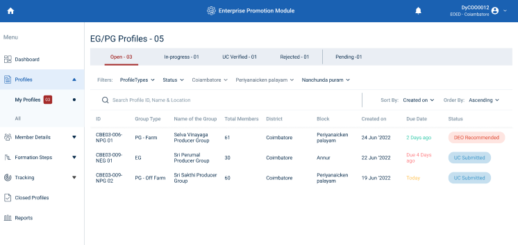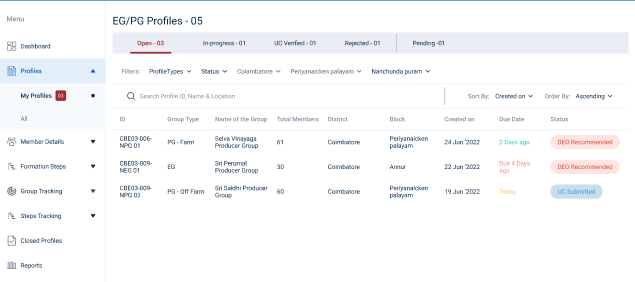 Step 8 : The DYCOO staff can view the Profile ID, Group Type, Group Name, Total Members, District Name, Block Name, Created Date, Due Date, and current status of the profile in the home page