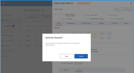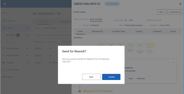 Step 12 : Once you click rework a confirmation popup will appear if the DYCOO send the profile to rework click ‘Confirm’ or click ‘Back’ and the status of the profile has changed from ‘UC Submitted’ to ‘Rework’