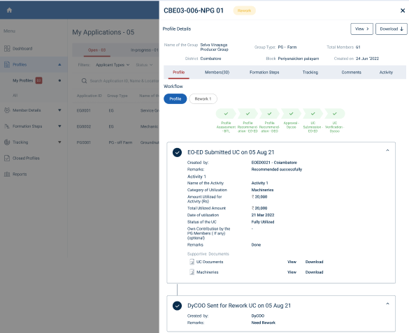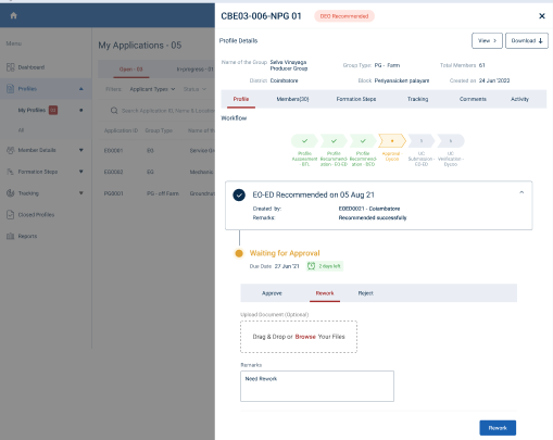 Step 7 : Once the profile has been reworked by the ECP, After that BTL will verify the reworked profile, then the EO-ED & DEO has recommended the profile, click the Rework menu under the profile tracker the DYCOO can view the list of profile reworked by the ECP in detail