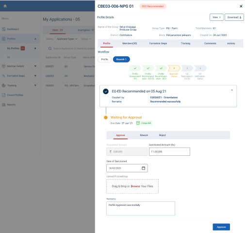 Step 6 : To approve the profile, Select the profile and for a detailed view, select the profile and the DYCOO can view the profile details, workflow tracker details