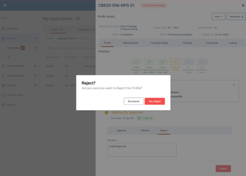 Step 9 : An confirmation popup will appear, If the DYCOO wish to reject the profile click ‘Yes Reject’ or click ‘No Cancel’