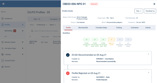 Step 6 : The DYCOO can view the list of rejected profiles under the tab, Select the profile to view the details more.