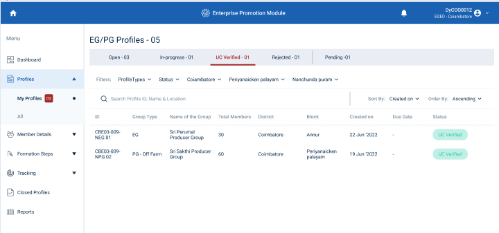 Step 6 : The DYCOO can view the list of UC submitted profiles under the tab, Select the profile to view the details more.