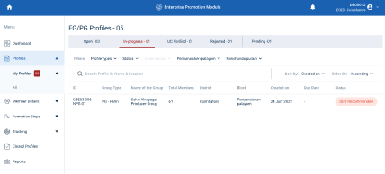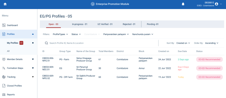 Step 8 : The DEO staff can view the Profile ID, Group Type, Group Name, Total Members, District Name, Block Name, Created Date, Due Date, and current status of the profile in the home page