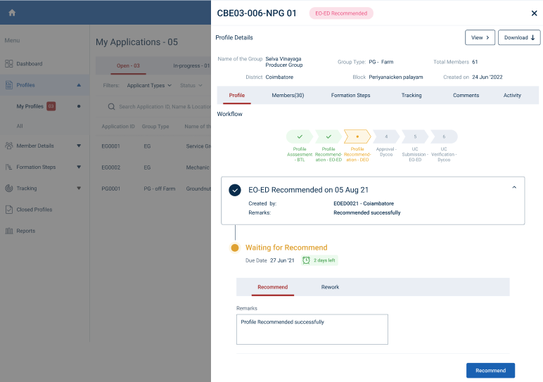 Step 6 : To recommend the profile, Select the profile and for a detailed view, select the profile and the DEO can view the profile details, workflow tracker details