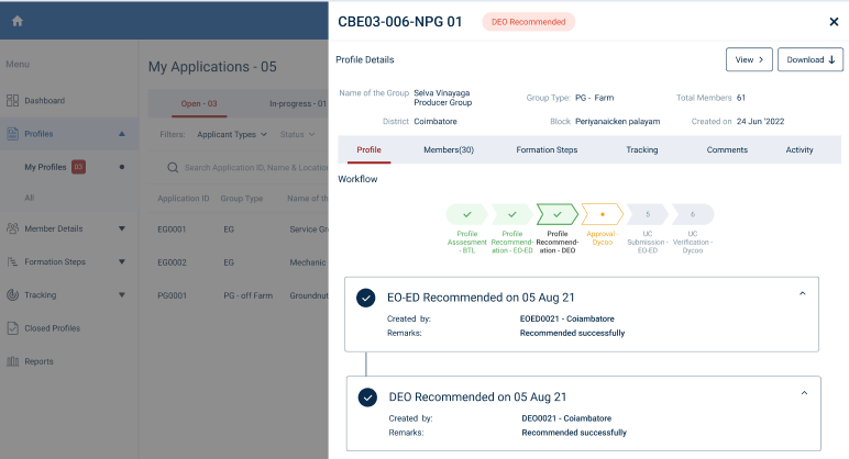 Step 7 : Once the profile has recommended by DEO, the DEO can view the profile details and updated workflow tracker