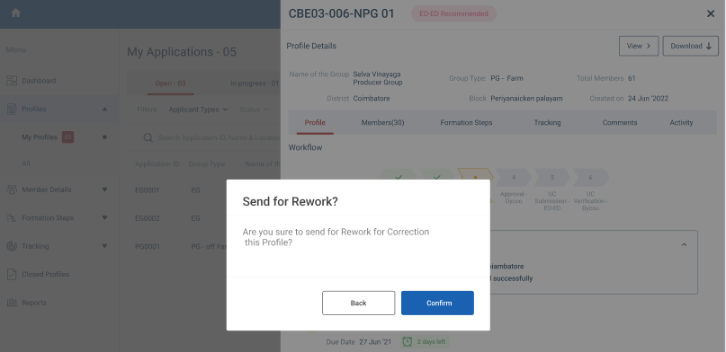 Step 7 : Once the profile has been reworked by the ECP, After that BTL will verify the reworked profile, then the EO-ED has recommended the profile, click the Rework menu under the profile tracker the DEO can view the list of profile reworked by the ECP in detail