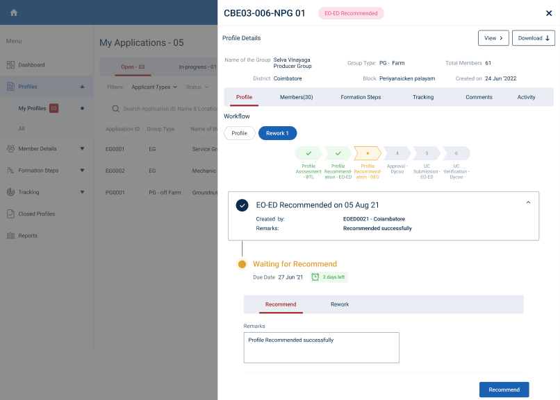 Step 8 : If the rework profile can recommend the DEO click ‘Recommend’ to recommend the reworked profile or if the DEO wish to rework the profile click ‘Rework’ and send the profile for the rework